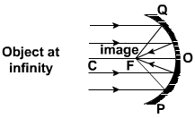 When an object is at infinity, the parallel beam coming from it meets at the focus F of the concave mirror after reflection. The image formed is real, inverted and highly diminished.