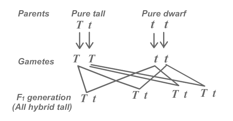 Ans: When cross is made between two parents having pure contrasting pair of characteristics then, hybrid is produced. For example, when a pure tall plant is crossed with pure dwarf plant then in it generation, hybrid tall is produced. i e.