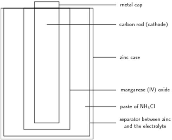 A dry cell is a portable cell. A dry cell consists of a zinc container whose base acts as the negative electrode. The carbon rod placed at the centre with a brass cap (metal cap) acts as the positive electrode. This is surrounded by a mixture of manganese dioxide and charcoal in a muslin bag. The electrolyte uses is a moist paste of ammonium chloride. The outer body (excluding the base) of the zinc container is insulated with cardboard.